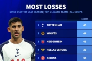 热刺上赛季以来各项赛事输掉45场,五大联赛最多