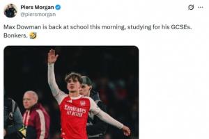 体育资讯03月16日讯 今天是周一,英国名嘴、著名阿森纳球迷皮尔斯·摩根社媒发帖,调侃阿森纳16岁小将道曼今天还要去上学。
