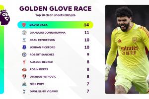 英超金手套奖最新排名: